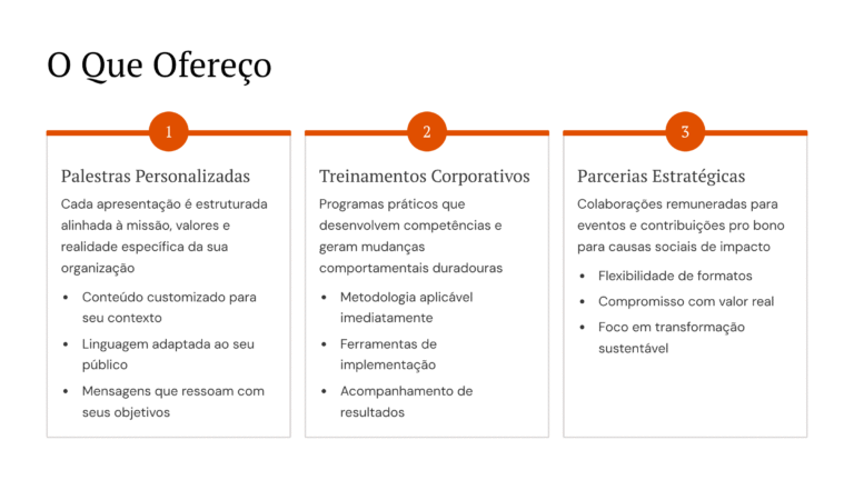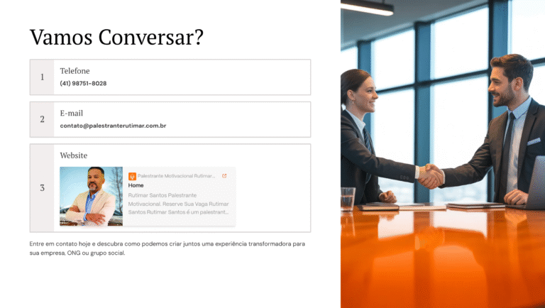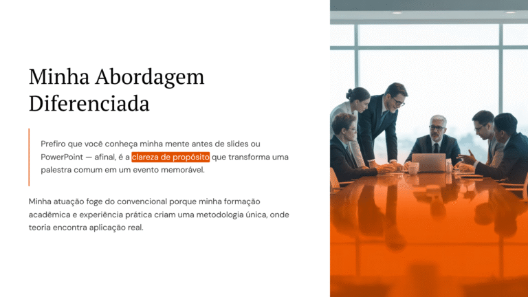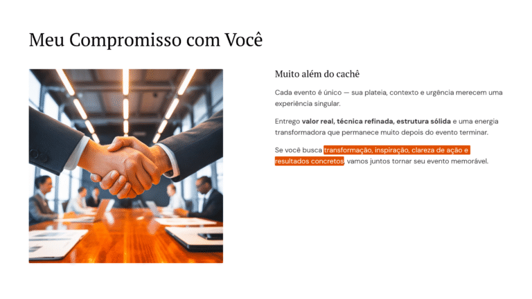 Meu diferencial é unir histórias reais, técnicas comprovadas e uma comunicação envolvente que inspira ação imediata. Não é apenas motivação momentânea, mas transformação prática para equipes e indivíduos.