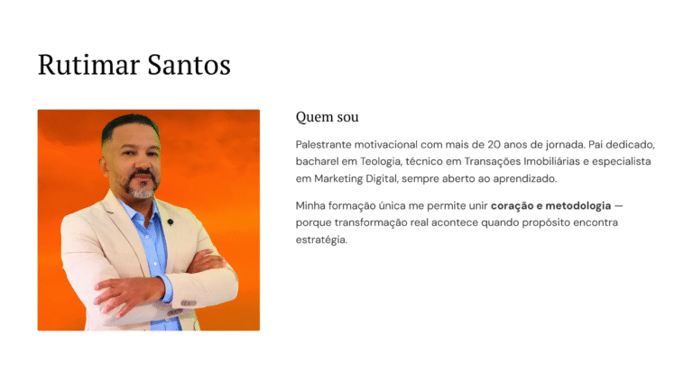 Rutimar Santos é palestrante motivacional, escritor e criador de conteúdos sobre liderança, superação e alta performance. Com anos de experiência em eventos corporativos, educacionais e comunitários, já impactou milhares de pessoas no Brasil com mensagens transformadoras.